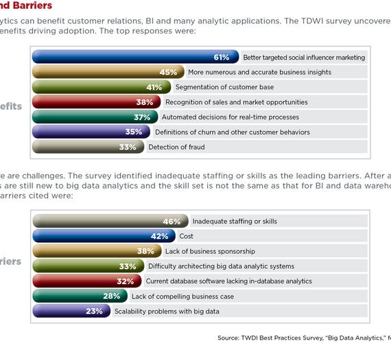 The Data Warehouse Institute (TDWI) realizó un estudio basado en las prácticas de más de 300 profesionales de TI, consultores, patrocinadores y usuarios, acerca del uso y análisis que le dan al Big Data. La mayoría de los encuestados (70%) consideró al Big Data como una oportunidad de negocio. Muchos de ellos utilizan análisis avanzados de datos (74%) y un tercio trabaja con análisis de Big Data (34%).