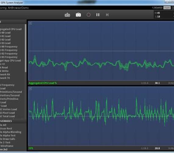 System Analyzer. Muestra información de desempeño del CPU, GPU y consumo de energía en tiempo real. Permite realizar experimentos de optimización con OpenGL sin necesidad de recompilar el código.