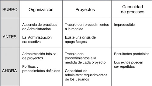 Finalmente, en noviembre del 2006 se llevó a cabo la evaluación formal SCAMPI A, donde se obtuvo el Nivel 2 (Administrado) de Madurez de procesos de ingeniería de software y el Nivel 3 (Definido) de Capacidad para los Procesos de Administración de Requerimientos, Planeación de Proyectos, Monitoreo y Control de Proyectos, Aseguramiento de la Calidad, Administración de la Configuración, Administración de Proveedores y Medición y Análisis.