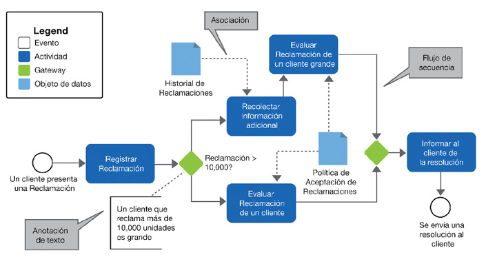 La figura 1 muestra un BPD modelando un proceso simple de reclamación. En ella podemos identificar los principales elementos de BPMN.