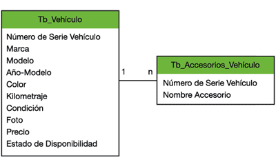 2. La aplicación Web utilizará la información que ya se mantiene dentro del Sistema de Inventario de Vehículos (SIV). Este sistema mantiene los vehículos y los posibles accesorios de cada uno de ellos. El modelo de datos que maneja es el siguiente: