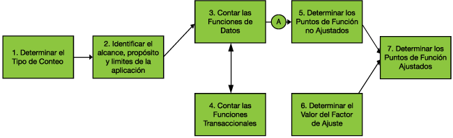 Planteado el caso práctico, podemos aplicar paso a paso el método de Análisis de Puntos de Función, para lo cual, haremos distinción de definiciones importantes que deben ser consideradas. Este es un proceso largo que veremos a detalle en el siguiente número de SG. Mientras tanto, comparto con ustedes el diagrama que muestra los pasos que estaremos realizando: