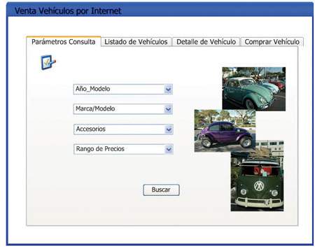 3. Un comprador potencial, podrá buscar un vehículo de dos formas: podrá ver todo el inventario, o filtrar con base a una serie de características de los vehículos. La pantalla de consulta será de la forma siguiente: