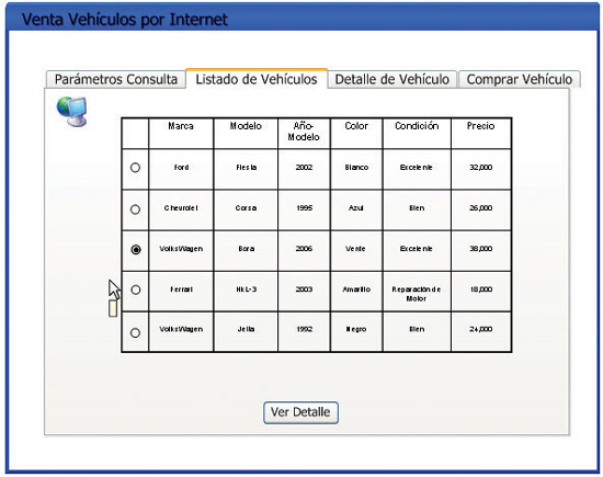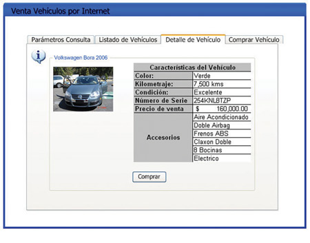 6. El comprador podrá entonces verificar el listado, y si ve un vehículo que le llame la atención, podrá seleccionarlo y hacer una consulta detallada, la cual se mostrará en la pantalla siguiente: