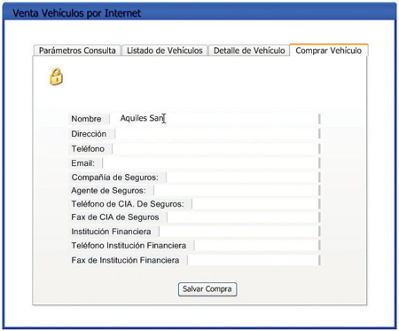 7. Si el posible comprador, decide comprar el vehículo, entonces presionará el botón “Comprar”, que lo llevará a la siguiente pantalla, en donde registrará sus datos, los de su aseguradora y los de su institución financiera. Tal y como se muestra en la pantalla siguiente: