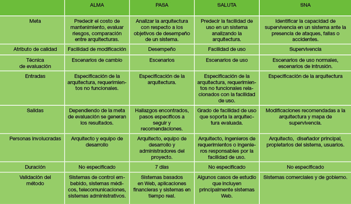 En esta segunda parte hemos presentado el método de evaluación ALMA, que se interesa por predecir la facilidad de modificación en una arquitectur. PASA, que analiza en la arquitectura el desempeño del sistema. SALUTA, que analizando una serie de atributos de calidad predice la facilidad de uso; y SNA, que analiza en la arquitectura, la supervivencia de un sistema ante la presencia de ataques, fallas o accidentes. La Tabla 1 presenta a manera de resumen, un cuadro comparativo entre estos cuatro métodos de evaluación.