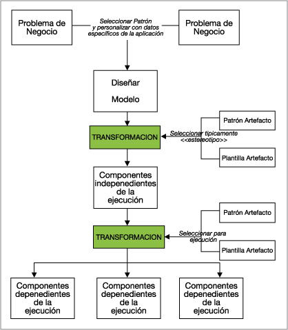 La figura 2 muestra el flujo de cómo un desarrollador puede utilizar las herramientas MDD para desarrollar parte de una aplicación de negocio. En este ejemplo, el desarrollador revisa el problema de negocio y selecciona un patrón de diseño. Esto aloja un modelo de diseño, y el desarrollador llena en detalle las funciones específicas del negocio que está construyendo. Posteriormente, el proceso de desarrollo es completamente automatizado. El desarrollador selecciona una opción para generar los artefactos, los cuales son empaquetados y colocados en el área de construcción. Entonces, el desarrollador puede seleccionar opciones, posteriormente para generar los artefactos adicionales para una plataforma de ejecución particular.
