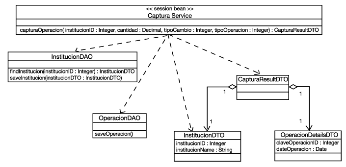 El acceso hacia los objetos de datos (Data Access Object - DAO) es a través de un EJB llamado CapturaService, donde cualquier validación y/o proceso de lógica de negocio es ejecutada. Por ejemplo, si la institución bancaria existe, o si la cantidad que se desea cambiar está dentro de los límites aceptables.