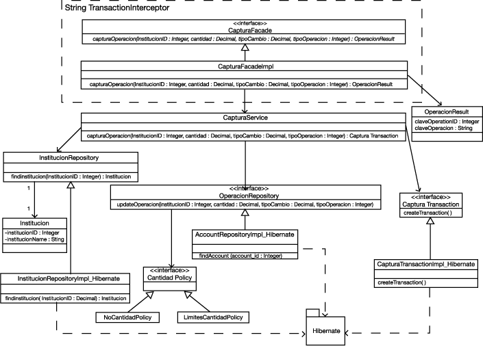 Debido al alto nivel de configuracion de Spring, la fábrica de SpringBean puede ser configurada para regresar un proxy en lugar del objeto original. Este proxy, también conocido como interceptor, es un objeto que finge ser el objeto original, pero que puede ejecutar código adicional antes y después de la invocación del objeto original, y por tanto sirve para muchos propósitos, como administrar transacciones, seguridad o conexiones a la base de datos. CapturaFaçade puede ser envuelto en un interceptor, el cual administra las transacciones con algún administrador de transacciones propio del framework de persistencia que estemos usando.