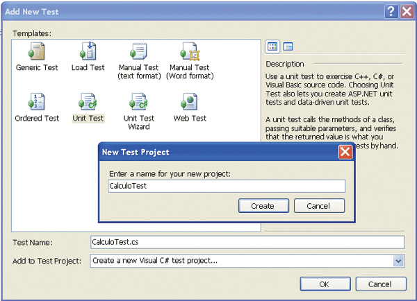 Ahora veamos con un ejemplo simple las capacidades que posee Visual Studio Team System (VSTS) para cubrir nuestras necesidades de testing. Supongamos que tenemos una clase Cálculo que posee algunos métodos para realizar cálculos matemáticos y queremos crear una serie de tests para verificar el correcto funcionamiento de éstos. VSTS incorpora un nuevo tipo de proyecto destinado a la labor de testing. En las figuras 1 y 2 podemos ver cómo agregar uno para nuestra clase Cálculo.