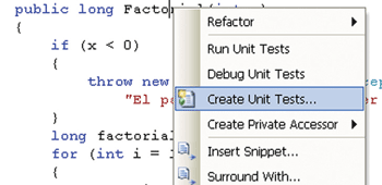 La clase Cálculo posee un método Factorial que realiza el cómputo del factorial de un número dado. El código del método factorial es el indicado en el ejemplo 1, esta es la primera aproximación, y contiene algunos errores (cualquier programador que mire atentamente el código podrá darse cuenta). Para crear un método de test unitario para el mismo sólo es necesario realizar click derecho sobre el método y seleccionar la opción “Create Unit Test”.