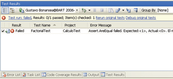 Luego de la primera ejecución del test obtenemos un resultado negativo indicando que ha fallado para el par de prueba (0,1).