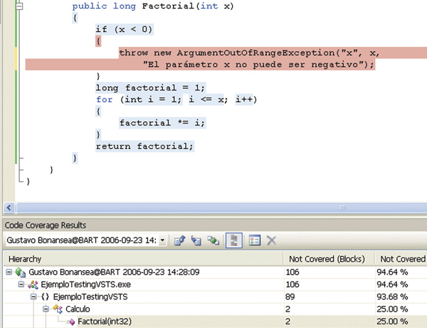 Una funcionalidad muy interesante que podemos utilizar es el “Code Coverage”, la cual analiza el código que ha sido efectivamente ejecutado, indicando qué porcentaje del código no ha sido cubierto por el conjunto de pruebas utilizado. En la figura 5 podemos observar que el código pintado de rojo no ha sido ejecutado nunca durante las pruebas, lo que indica que el conjunto de pruebas no es lo suficientemente amplio para cubrir todas las posibilidades contempladas por la función.