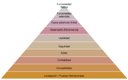 La punta de la pirámide es ver la funcionalidad básica: ¿el software hace lo que debe de hacer? Si es una calculadora, ¿hace las operaciones básicas? La siguientes pruebas son las de funcionalidad extendida, ¿además de sumar, restar, multiplicar y dividir, también puedes obtener raíz cuadrada?, ¿qué tal porcentajes? También hay que probar casos extremos, si la calculadora maneja enteros, ¿qué pasa si le pongo un número entero mayor al que puede desplegar?, ¿qué pasa si hago operaciones con números decimales?, ¿qué pasa si hago operaciones con cero? Por otro lado, el performance también es importante, ¿la calculadora se tarda más tiempo en dar el resultado que hacer yo la operación en la mente? Hoy en día también vale la pena evaluar si el software es fácil de usar, ¿necesito leer cien páginas de instructivo para saber usarlo?, ¿es intuitivo?, ¿cuántos clicks tengo que dar para llegar a un resultado? Las pruebas de seguridad no hay que olvidarlas, ¿pueden otras personas ver lo que estoy haciendo con mi software? Los sistemas de misión crítica necesitan correr los 365 días del año las 24 horas del día, ¿puedo confiar en que el sistema estará corriendo todo el tiempo?, ¿es de uso rudo?, ¿qué pasa si lo someto a condiciones de estrés? Estas pruebas son las de confiabilidad y estrés. Compatibilidad, ¿cómo trabaja mi aplicación sobre X sistema operativo? Y qué pasa si quiero exportar esa calculadora, ¿la puedo vender en Japón?, ¿cumple con los estándares de calidad japoneses?