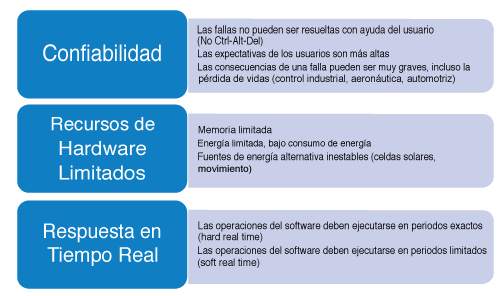 El desarrollo de embedded software presenta retos para los desarrolladores de software que son diferentes a los que se presentan en el desarrollo tradicional para computadoras o servidores. Los tres atributos que típicamente tienen consideraciones especiales en el desarrollo de software embedded son: confiabilidad, limitaciones en recursos de hardware, y respuesta en tiempo real. La figura 1 ilustra y explica de forma más detallada dichos retos.