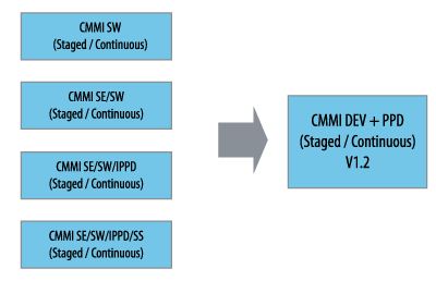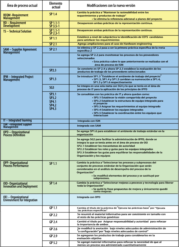 La disciplina de IPPD se actualiza de manera significante. El material del área de proceso OEI (Organizational Environment for Integration) fue eliminado e integrado en OPD. De igual forma, el material del área de proceso IT (Integrated Teaming) se eliminó, para incorporarse en IPM. Las metas para el cumplimiento de la disciplina, ahora estarán consolidadas en OPD como “Permitir la administración de IPPD” y en IPM como “Aplicar los principios de IPPD”. Además, el material fue condensado y actualizado para ser consistente con otras áreas de proceso.