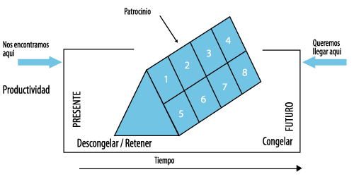 Una vez entendidas las fuerzas externas. Los aspectos formales e informales que tenemos que involucrar para implantar el cambio, y lograr el “estado deseado”, (identificadas en cada cuadro), se pueden atacar a través de ocho estrategias: