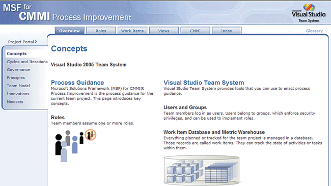 Altamente acoplada con la plantilla de proceso está la orientación del proceso, que es la documentación acerca de roles, actividades, productos de trabajo y reportes personalizados para un método de ingeniería de software. En muchas organizaciones de desarrollo, los documentos de orientación del proceso forman un interminable grupo de carpetas mientras que en Team System, la orientación del proceso está completamente integrada a las herramientas de desarrollo. (Ver la siguiente figura)