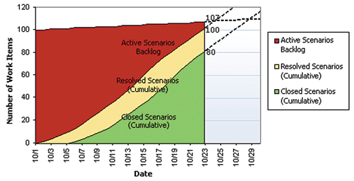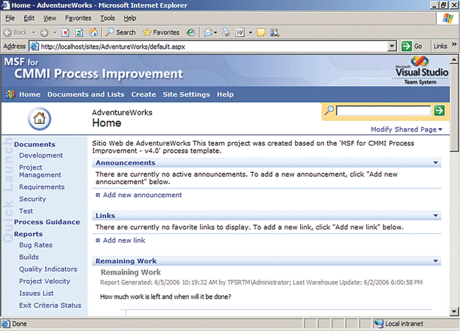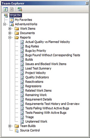 Por otro lado, cada plantilla de proceso incluye un conjunto predefinido de reportes. Los reportes constituyen una de las herramientas más poderosas de VSTS ya que permiten al administrador del proyecto monitorear el estado y tendencias del proyecto de equipo. TFS incluye un almacén de datos en el que se recopilan los datos operativos que provienen de los elementos de trabajo, control de versiones, generaciones del producto y resultados de las pruebas. Este almacén es empleado para producir los reportes. Una de las enormes ventajas de usar Team System, desde la perspectiva de administración de proyectos, es que no es necesario correlacionar manualmente datos provenientes de varias fuentes.