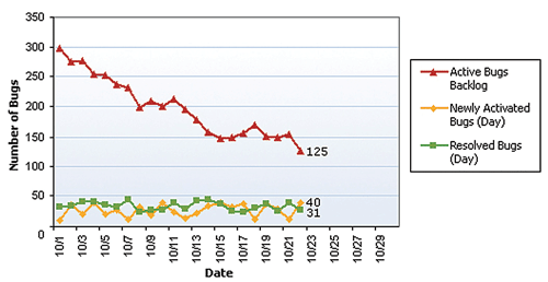 Entre los reportes que se incluyen están: reportes estilo semáforo sobre la salud del proyecto, reportes informativos que muestran: la tasa de defectos, la productividad del equipo, la efectividad de las pruebas en las distintas generaciones del producto, el progreso del trabajo en el tiempo y la estabilidad de los requerimientos en el tiempo. (Ver las siguientes dos figuras.)