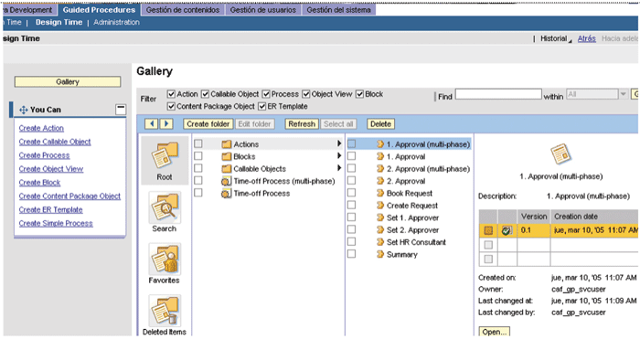 Los elementos de Guided Procedures (Callable Objects, Acciones, Bloques, etc) se agrupan en una estructura similar a un sistema de archivos. El acceso y administración de estos elementos se hace en la Galería de Guided Procedures.