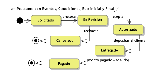 Todo objeto tiene un principio, pues necesariamente debe de nacer en algún estado. Dicho estado se representa con un círculo relleno. Por otro lado, un objeto puede tener de cero a N estados finales, los cuales se representan por un círculo relleno, dentro de otro círculo hueco. El estado final es el último estado en el que queda un objeto antes de desaparecer, o cuando deja de tener más comportamiento. Los objetos que se mantienen siempre activos regresan una y otra vez a estados anteriores, por eso no tienen un estado final. En cambio hay objetos que pueden terminar su vida de diferentes maneras; en diferentes estados. El diagrama 2 representa los estados y transiciones de un préstamo. Procesar, aceptar, rechazar, depositar son eventos que ocasionan cambios de estado. [monto = adeudo] es una condición de guardia. Los primeros son verbos y el segundo es una expresión booleana.