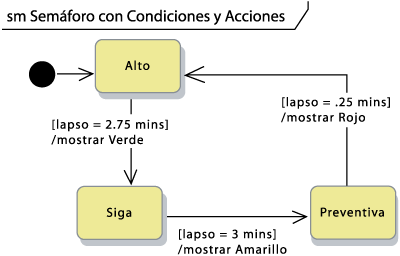 No porque el objeto pueda tener ocho posibles estados significa que puede pasar a cualquiera de ellos en cualquier momento. Uno de los valores que ofrece este diagrama es precisamente que establece las reglas para que el objeto, estando en un estado determinado, pueda pasar a otro. Por ejemplo, si el semáforo está en verde no debe de poder pasar a rojo, sino únicamente a amarillo. Estos cambios y restricciones se muestran con una flecha, que es el símbolo para las transiciones entre estados.