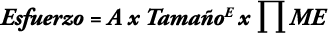 Donde A es una constante, E es un indicador de economías de escala (calculado en base a los factores de escala), y ME es el promedio de valores de los multiplicadores de esfuerzo.