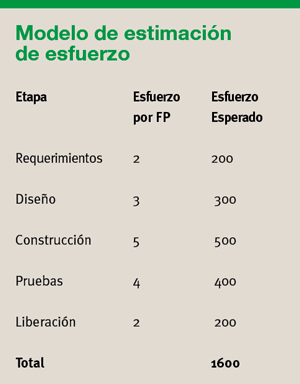 Con esto ya podemos determinar el tamaño de un sistema. Pero ahora, ¿cómo podemos obtener el esfuerzo y duración del proyecto? Imaginemos que vamos a desarrollar un sistema de 100 FPs, y que usaremos un ciclo de vida tradicional en cascada con las siguientes etapas: análisis de requerimientos, diseño, construcción, pruebas y liberación a producción.
