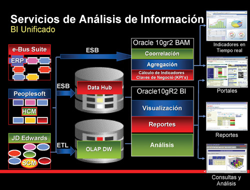 La figura 1 muestra los diferentes elementos que pueden conformar una solución de “BI Unificado”, bajo el escenario descrito en este artículo. Este caso particular está ejemplificado con productos de Oracle, pero es posible utilizar herramientas de distintos proveedores para cada caso. A fin de cuentas, esta capacidad es una de las grandes ventajas de las arquitecturas abiertas y orientadas a servicios.