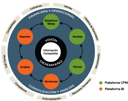 “un conjunto de tecnologías y procesos que permiten a las Organizaciones traducir estrategias corporativas en planes de acción, monitorear la ejecución de estos y proveer información que derive en importantes mejoras financieras y operativas”