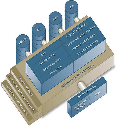 Actualmente, existen plataformas como la de Hyperion® System 9TM (Ver figura 2), la cuál permite una convergencia real entre las aplicaciones de Inteligencia de Negocio y de Administración del Desempeño, entregando la información por medio de una sola interfaz Web incrementado el nivel de adopción por parte de los usuarios. Para los profesionales de TI, ofrece una administración centralizada e incorpora la gestión de datos maestros (Master Data Management, MDM) que sincroniza los datos y catálogos almacenados en las diversas fuentes de información evitando con esto inconsistencias.