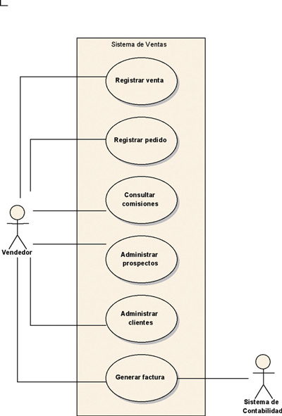 Una vez identificados los usuarios del sistema (actores primarios) habrá que preguntarles en qué situaciones valdrá la pena para ellos utilizarlo. La lista identificada de dichas situaciones no debería de tener pequeñas funciones, sino flujos completos que le proporcionen suficiente valor tanto a ellos como al negocio, de manera que “valga la pena usar el sistema” en dichas situaciones. Ejemplo: un vendedor en cierto sistema de ventas querrá “Registrar venta”, “Registrar pedido”, “Consultar comisiones”, “Administrar prospectos”, “Generar factura” y “Administrar clientes”. Todas ellas son ejemplos de situaciones u objetivos importante que podría necesitar un vendedor para llevar a cabo su trabajo, conocidas y modeladas como casos de uso en UML, tal como se muestra en el diagrama.