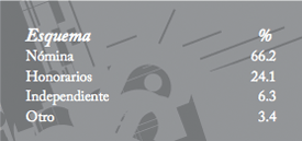 Podemos ver que la mayoría de los profesionistas de sistemas trabajan en organizaciones cuyo negocio no es la tecnología de información. Esto denota una industria de TI poco madura, que es principalmente “usuaria”, en lugar de creadora o proveedora. De hecho, esta es una de las métricas que Secretaría de Economía rastrea para medir el avance de ProSoft, y se espera que esta relación sea revertida para el 2013. Es decir, que la mayoría de los profesionistas de software de nuestro país laboren en empresas proveedoras o creadoras de TI, dejando alrededor de un 30% en áreas usuarias. Esquema de contratación Uno de los temas tabú en México es el de si las empresas deben pagar por nómina u honorarios. El esquema de honorarios es conveniente para las empresas, debido a la flexibilidad que les brinda. Sin embargo, el problema es la falta de protección con que deja a los empleados, lo cual típicamente provoca insatisfacción.