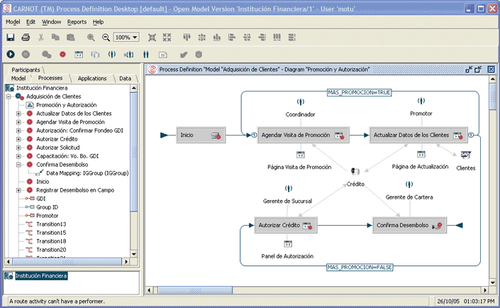 En la Figura 1, podemos ver un proceso de adquisición de clientes, mapeado e integrado en el CARNOT Definition Desktop, donde podemos ver aplicaciones y datos empresariales integrados a un mismo nivel de abstracción. El motor de procesos de CARNOT juega el rol de Controlador bajo el patrón MVC, ya que es el orquestador que sincroniza a todas las entidades de negocio requeridas para generar valor. En este caso, otorgando un crédito a un nuevo cliente. En el mismo contexto, las aplicaciones (“Página Vista de Promoción”, “Página de Actualización” y “Panel de Autorización”) son las Vistas y los datos (“Crédito” y “Clientes”) son los Modelos.