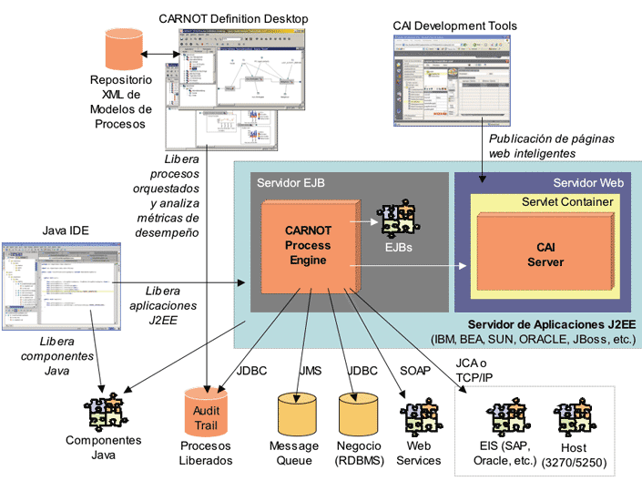 En la Figura 2, podemos apreciar la arquitectura MVC-SOA sobre la plataforma J2EE extendida por el CARNOT Process Engine y el CAI Server, desde el punto de vista del ambiente de desarrollo.