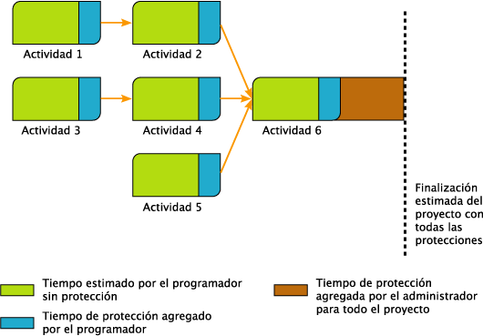 La metodología CC inicia con la construcción de una red de actividades compuesta por varias cadenas de actividades dependientes. Una de estas será definida como la cadena crítica y las demás como cadenas alimentadoras, que se unen a la cadena crítica en algún punto del calendario. Una característica de CC es que evita agregar tiempo de protección, o “colchón” a cada actividad. Se inicia con una estimación de la duración de cada actividad (sin “colchón”). Al final de cada cadena, ya sea crítica o alimentadora, se agrega un “amortiguador” que proteja a toda la cadena. En la figura 2 vemos un ejemplo de la ubicación de los “amortiguadores” en la secuencia de actividades y podemos apreciar que no cambia la fecha de terminación del proyecto, simplemente quitamos la protección individual de las actividades y la ubicamos al final.