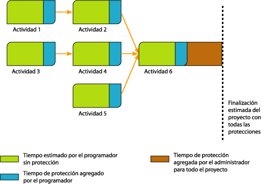 Volvamos con nuestro atribulado administrador de proyecto, Juan. Durante la estimación, es probable que su grupo de desarrollo haya agregado un “colchón” de tiempo de protección para cada una de las actividades del plan de trabajo. Como es probable que Juan no se haya dado cuenta de eso, a su vez él agregó otro “colchón” de protección para todo el proyecto, esto lo podemos ver en la Figura 1.