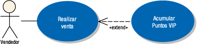 Extend. La polémica al querer seleccionar una de las dos relaciones es que en el “extend” también podemos ver, desde la perspectiva del usuario, a los dos flujos como si fueran uno sólo. Y en ciertos escenarios el caso de uso base no podría cumplir su objetivo si no se ejecutara la extensión. Pero la principal diferencia entre estos dos tipos de relación, es que en el caso del “extend” hay situaciones en que el caso de uso de extensión no es indispensable que ocurra, y cuando lo hace ofrece un valor extra (extiende) al objetivo original del caso de uso base. En cambio en el “include” es necesario que ocurra el caso incluído, tan sólo para satisfacer el objetivo del caso de uso base. Ejemplo: Puedes “Realizar Venta” sin “Acumular Puntos de Cliente VIP”, cuando no eres un cliente VIP. Pero, si eres un cliente VIP sí acumularás puntos. Por lo tanto, “Acumular Puntos” es una extensión de “Realizar Venta” y sólo se ejecuta para cierto tipo de ventas, no para todas.