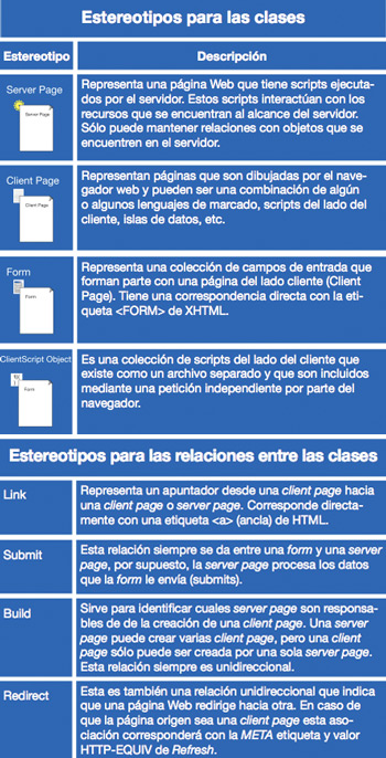 Algunos de los ejemplos más comunes de estereotipos que se pueden asociar a las clases y a las relaciones entre éstas, para representar una aplicación en web son las siguientes:
