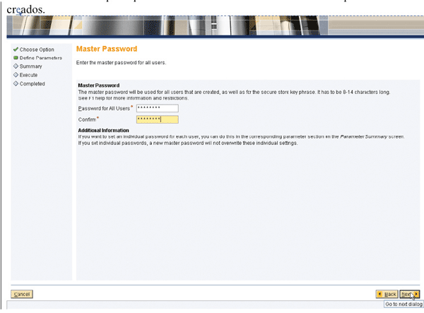 Memorice la contraseña que usted definirá en el paso 7, pues la misma, es la contraseña maestra de autenticación para varias situaciones. Después de la instalación, los varios usuarios y contraseñas son: