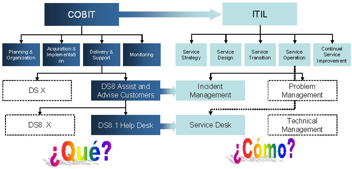Estos procesos están alineados al COBIT de una manera significativa, por ejemplo cuando en el dominio de COBIT Delivery & Support, en el control DS8 Assist and Advise Customers, y el subcontrol DS 8.1 Help Desk, se requiere un punto de contacto, el cual en ITIL se refiere al “la funcion de Service Desk“, que esta en la fase de “Service Operations” en donde menciona que características se requieren para habilitar esta función y recomendaciones para que funcione como punto único de contacto.