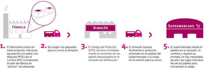 Esta tecnología, junto al EPC (Código Electrónico de Producto), harán posible el rastreo y seguimiento de productos en tiempo real permitiendo una “visibilidad” casi perfecta de la mercancía desde el almacén de materia prima hasta el punto de venta1. El Código Electrónico de Producto es un número único que se graba en el chip contenido en una etiqueta RFID y se coloca en cada producto, lo que permite hacer un seguimiento exacto de cada unidad física en la cadena de suministros.