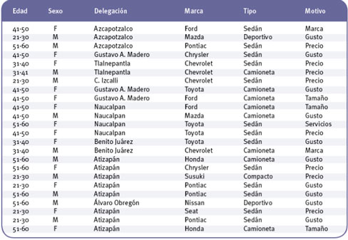 A continuación vamos a realizar un ejemplo de minería dirigida con una muestra de datos referentes a las preferencias de compra de automóviles. La muestra fue recabada dentro de una población reducida de clase media, cuyo centro de trabajo se encuentra en la zona centro de la ciudad. Los tipos de datos son nominales.