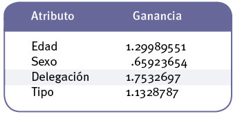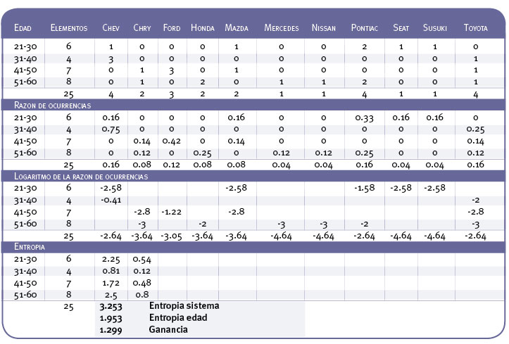 Realicemos la minería paso a paso, con un pequeño subconjunto de los datos anteriores, el método que emplearemos se conoce como ID3, éste es una estrategia que divide y conquista, que opera tratando de maximizar el nivel de ganancia en cada paso. La siguiente tabla contiene el cálculo de la entropía para el atributo edad, se realiza el cálculo de la entropía de cada atributo, la cuál es una medida de la incertidumbre existente en el conjunto de atributos, de los cuales se escoge sólo aquel atributo con mayor ganancia (diferencia entre la entropía del sistema y la entropía del atributo). El atributo seleccionado es el nodo del árbol. Este cálculo se repite desde la selección de la raíz y para cada nivel del árbol.