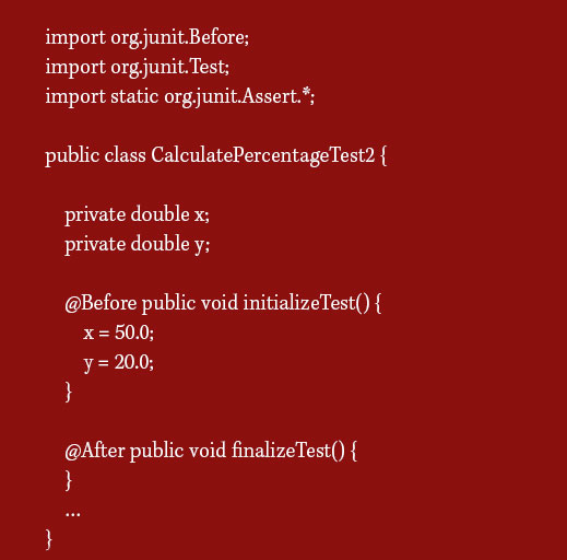 @Before antes de ejecutarse cada uno de los métodos de prueba y la de los métodos anotados con @After se hará después de la ejecución de cada una de las pruebas. Ejemplo: