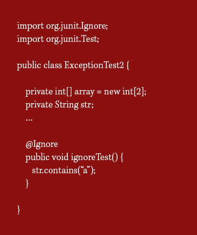 Ya no será necesario comentar un método de prueba cuando no queramos que éste se ejecute, quizá porque aún no desarrollamos la implementación del código a probar o porque sólo queremos probar algún otro método en particular. Los métodos anotados con @Ignore serán ignorados para su ejecución. Ejemplo: