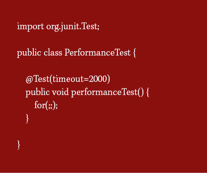 JUnit 4 proporciona ayuda para realizar pruebas de desempeño dentro de las pruebas unitarias. Y aunque no resuelve de todo el tema de este tipo de pruebas por no ser su objetivo principal, sí proporciona una ayuda importante. Ejemplo: