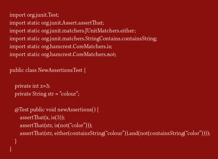 JUnit ha sido diseñado desde sus inicios, para de manera eficiente poder capturar las intenciones del desarrollador sobre su código y rápidamente poder revisar que cubra éstas intenciones. Sin embargo, existen algunas cosas que son difíciles de decir con JUnit 3 y que con JUnit 4 se hará mas fácil integrando la aserción assertThat(). Nota: Esta nueva aserción se incluye a partir de la versión 4.4 del framework. Ejemplo:
