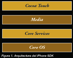 Para entender a grandes rasgos el funcionamiento del dispositivo, y más importante, cómo es que nuestra aplicación convive con el mismo, debemos conocer como funciona la plataforma y qué partes la componen. Similar al Mach Kernel encontrado en Mac OS X, se encuentra el componente más importante: el Kernel de iPhone OS. Encima de éste se encuentran diversas capas las cuales nos proporcionan los servicios que darán vida a nuestra aplicación.